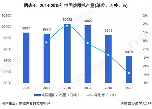 2019年,中國廢酸總產量為9479萬噸,同比下降3.9%。廢硫酸為主要主要廢酸產出種類,2019年,廢硫酸產出量為9020萬噸左右,占廢酸產出量的95.2%。