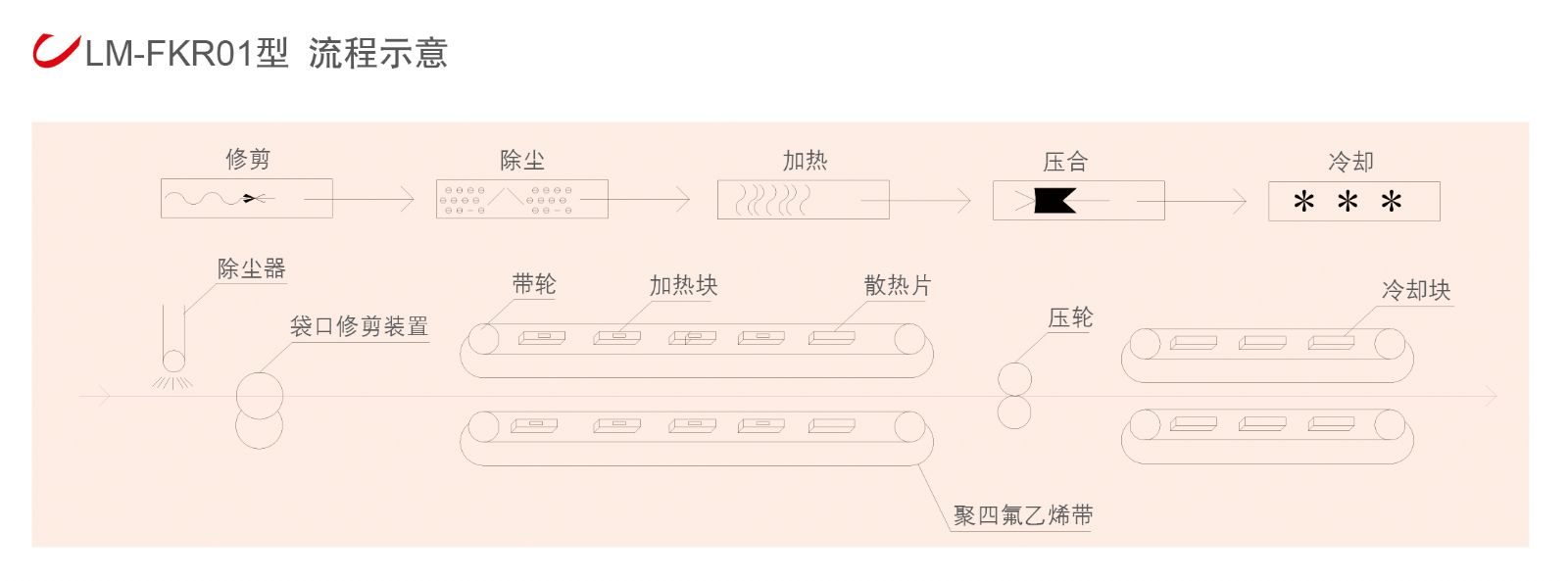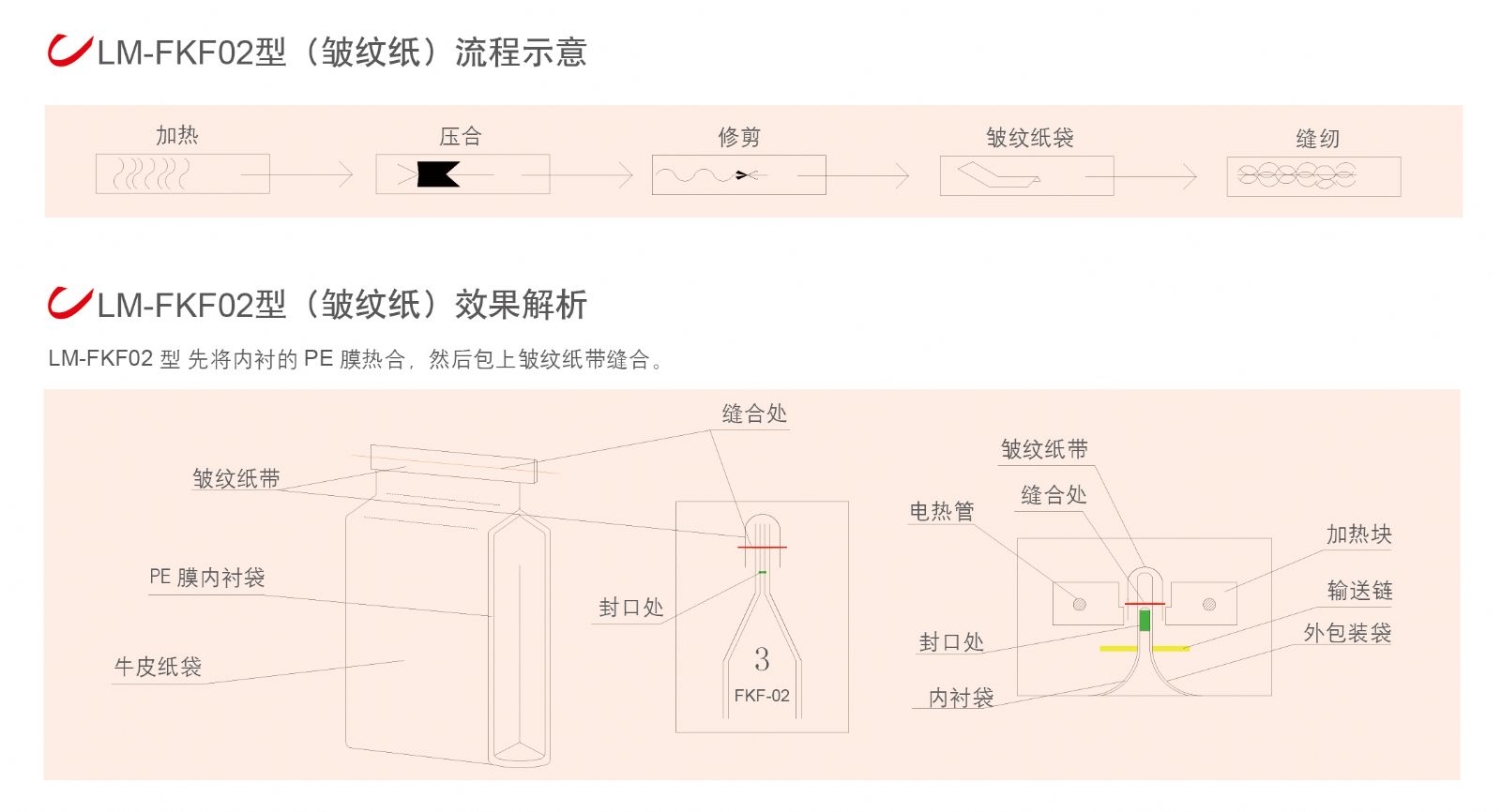 LM-FKR系列連續式熱合封口機適用于較厚的PE或PP塑料袋,以及內表面涂膠的紙塑復合袋、牛皮紙袋、鋁塑復合袋。該機可按編程自動完成包裝袋袋口的除塵、修剪、熱封、壓合、冷卻、計數等工序。經熱合封口的包裝袋密封性能極佳,可防塵、防蛀、防潮、防污染,使包裝物受到妥善的保護。