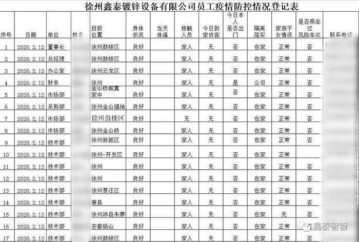 Полный контроль над основной ситуацией в компании и ее семье во время эпидемии. 9 февраля началась работа по созданию « Регистра основных обстоятельств вспышки болезни среди персонала компании Xintai Company»,Ежедневно регистрируйте информацию о сотрудниках, особенно перед возвращением на завод источник, обратно в Сюй или медленно, есть ли история путешествий в Хубэй, температура тела за два дня до возвращения на заводНормально ли, есть ли простуда, лихорадка, одышка, возвращение к месту жительства Сюй и так далее. Сосредоточьтесь на шести сотрудниках, которые возобновили работу на местах, организуйте специальных сотрудников для отслеживания их ситуации и возвращайтесь в соответствии с правилами более высокого уровня, чтобы провести домашнюю изоляцию.