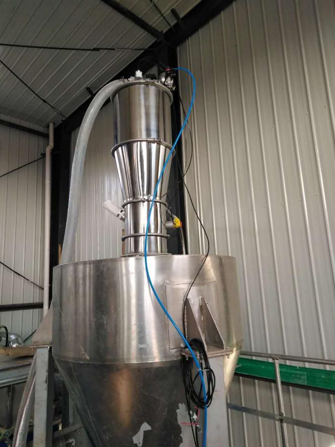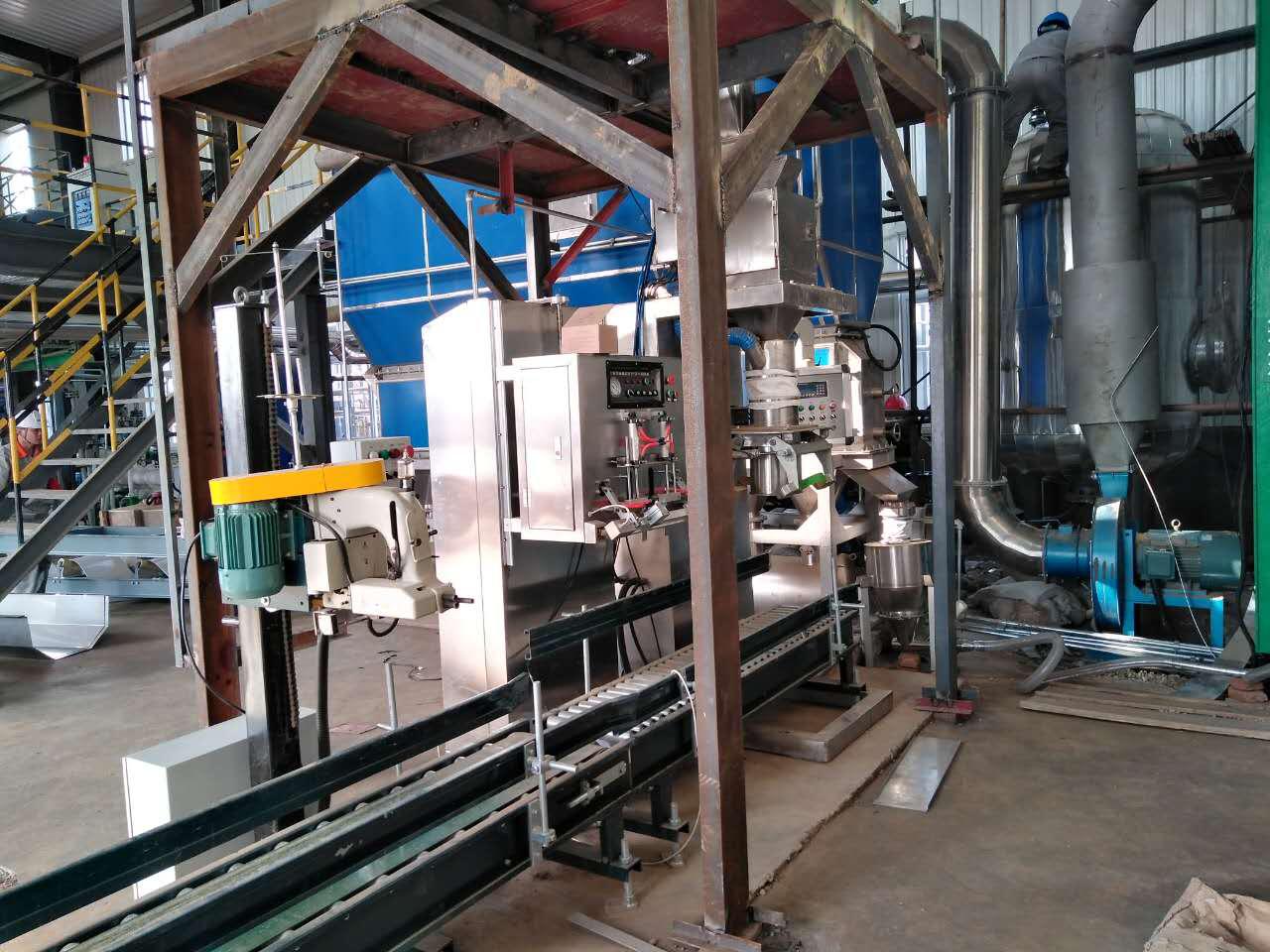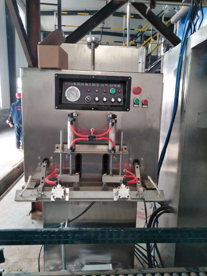集料分配裝置接收干燥機組的出料,經(jīng)加速室由負壓氣力輸送系統(tǒng)輸送至緩存料倉,再通過分料器為包裝機供料,包裝機采用特殊夾袋機構(gòu),配合除塵系統(tǒng)避免揚塵。抽真空熱合機和縫包機對滿袋物料進行密封封口,配合變頻皮帶輸送機協(xié)同輸送包裝袋。此套儲運、包裝系統(tǒng)在滿足用戶生產(chǎn)需要,提供自動化的同時,又大大改善了操作環(huán)境。受到客戶的高度贊揚。